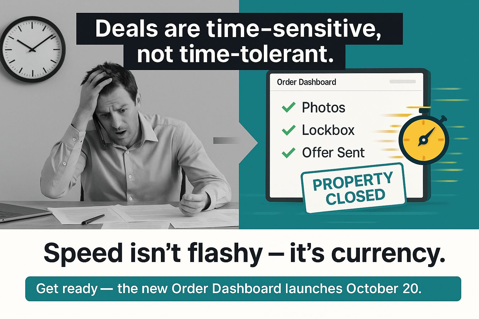 Deals are time-sensitive, not time-tolerant. In real estate, speed isn’t flashy, it’s currency. Since we began building the new Order Dashboard (expected release: October 20), we’ve been obsessed with one metric: how fast you can move from lead to asset in hand. The faster you get eyes on a property, the sooner you control the conversation, and the offer.